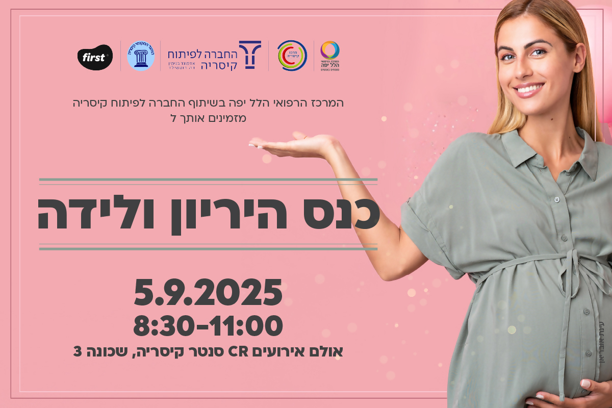 המרכז הרפואי הלל יפה מזמין אותך לכנס הריון ולידה, שיתקיים ביום שישי, 5.9.25, בשעה 8:30, באולם האירועים CR סנטר, קיסריה, שכונה 3, בהובלת מיטב מומחי הלל יפה.