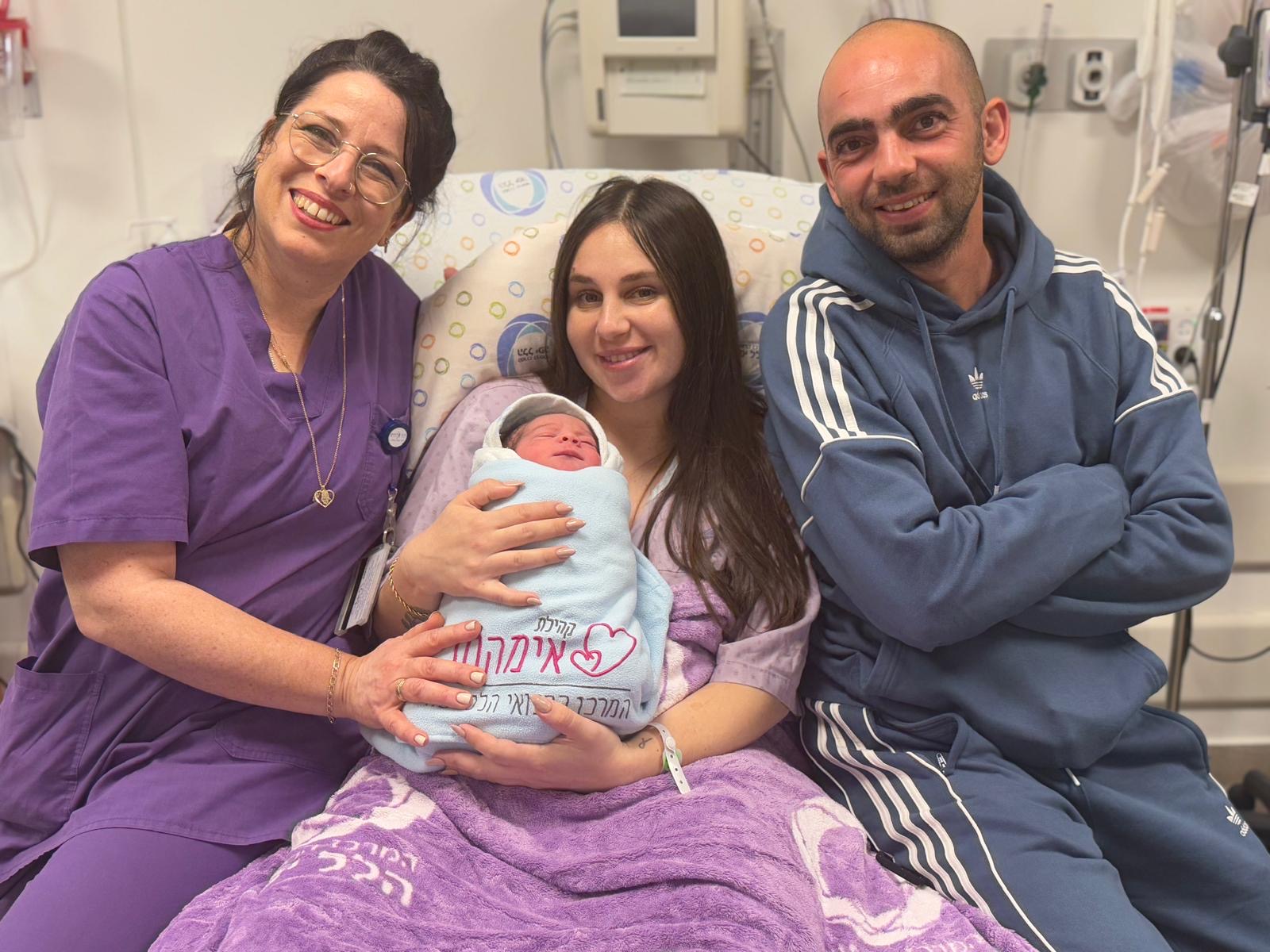 الزوجان السعيدان مع ابنهما والقابلة تمار يسرائيل في المركز الطبي هيلل يافه