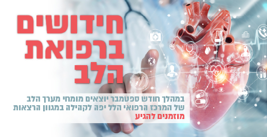 לכבוד יום הלב הבינלאומי צוות מערך הלב של המרכז הרפואי הלל יפה מזמין אתכן לסדרת הרצאות בנושא חידושים ועדכונים ברפואת הלב.