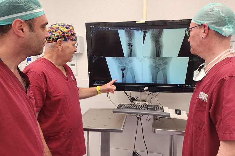 الدكتور بوعز جرانوت، الدكتور محمد يونس والدكتور إيال ماركادو من قسم جراحة العظام في هيلل يافه، معجبون بصور الأشعة السينية قبل وبعد العملية الجراحية