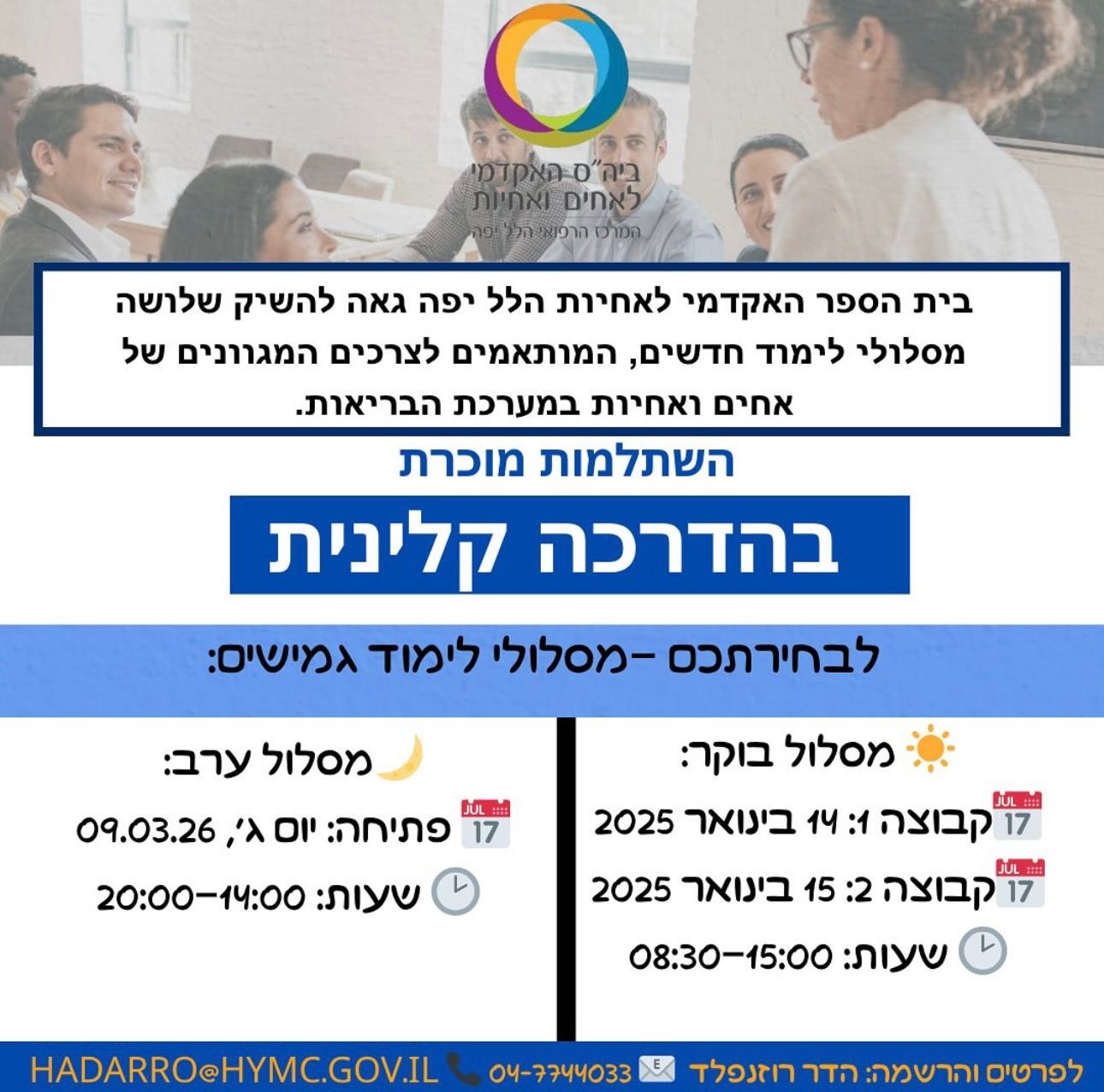 בדבר פרטים נוספים והרשמה ניתן לפנות למזכירת השתלמות מוכרת ביה"ס לאחים ואחיות הלל יפה :