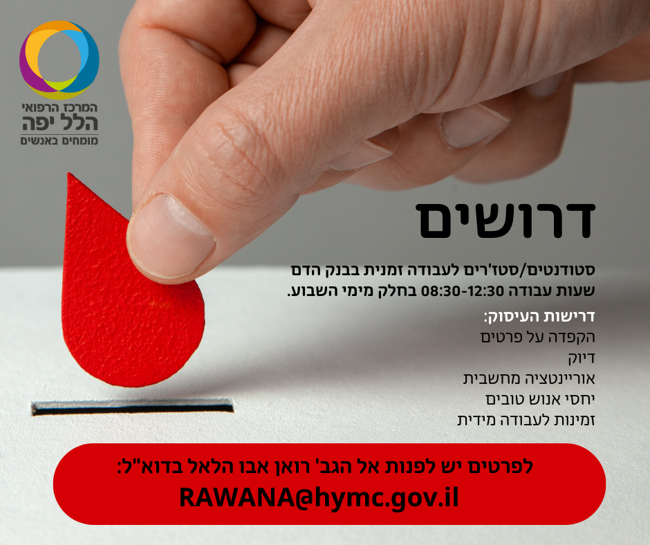 דרושים/ות סטודנטים/ות / סטאז'רים/ות לעבודה זמנית בנק הדם.