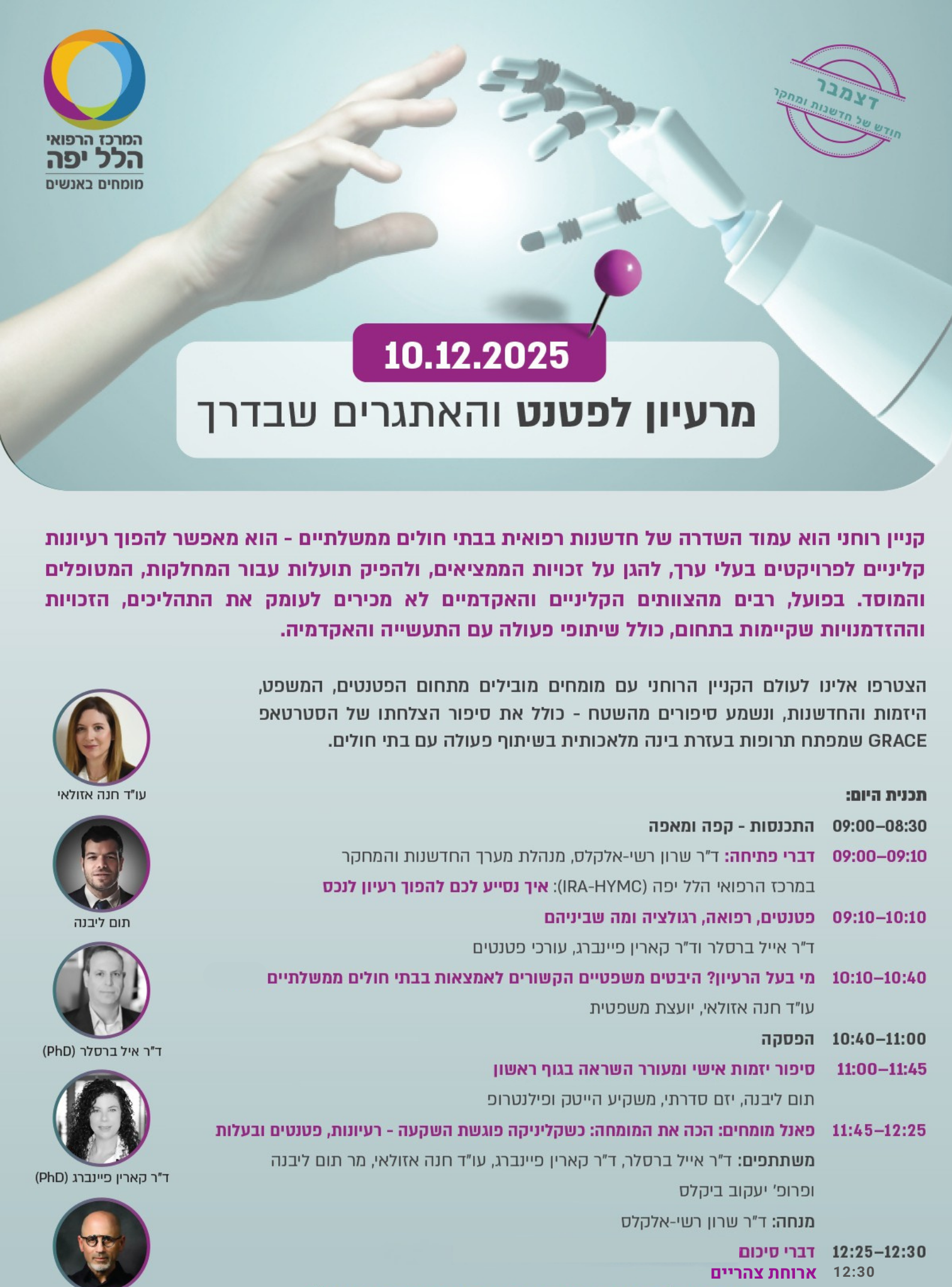 קניין רוחני הוא עמוד השדרה של חדשנות רפואית בבתי חולים ממשלתיים - הוא מאפשר להפוך רעיונות קליניים לפרויקטים בעלי ערך, להגן על זכויות הממציאים, ולהפיק תועלות עבור המחלקות, המטופלים והמוסד. בפועל, רבים מהצוותים הקליניים והאקדמיים לא מכירים לעומק את התהליכים, הזכויות וההזדמנויות שקיימות בתחום, כולל שיתופי פעולה עם התעשייה והאקדמיה.
